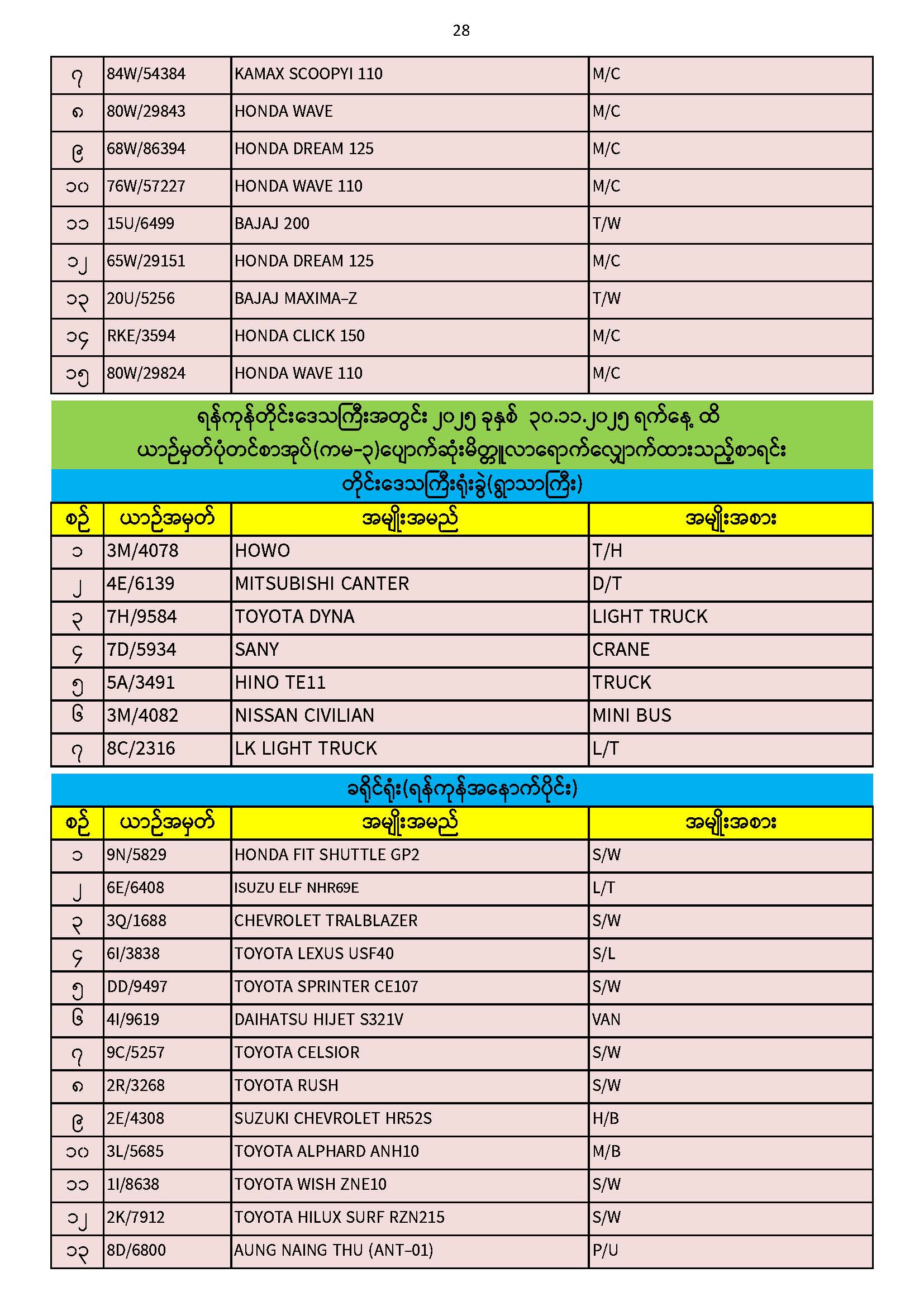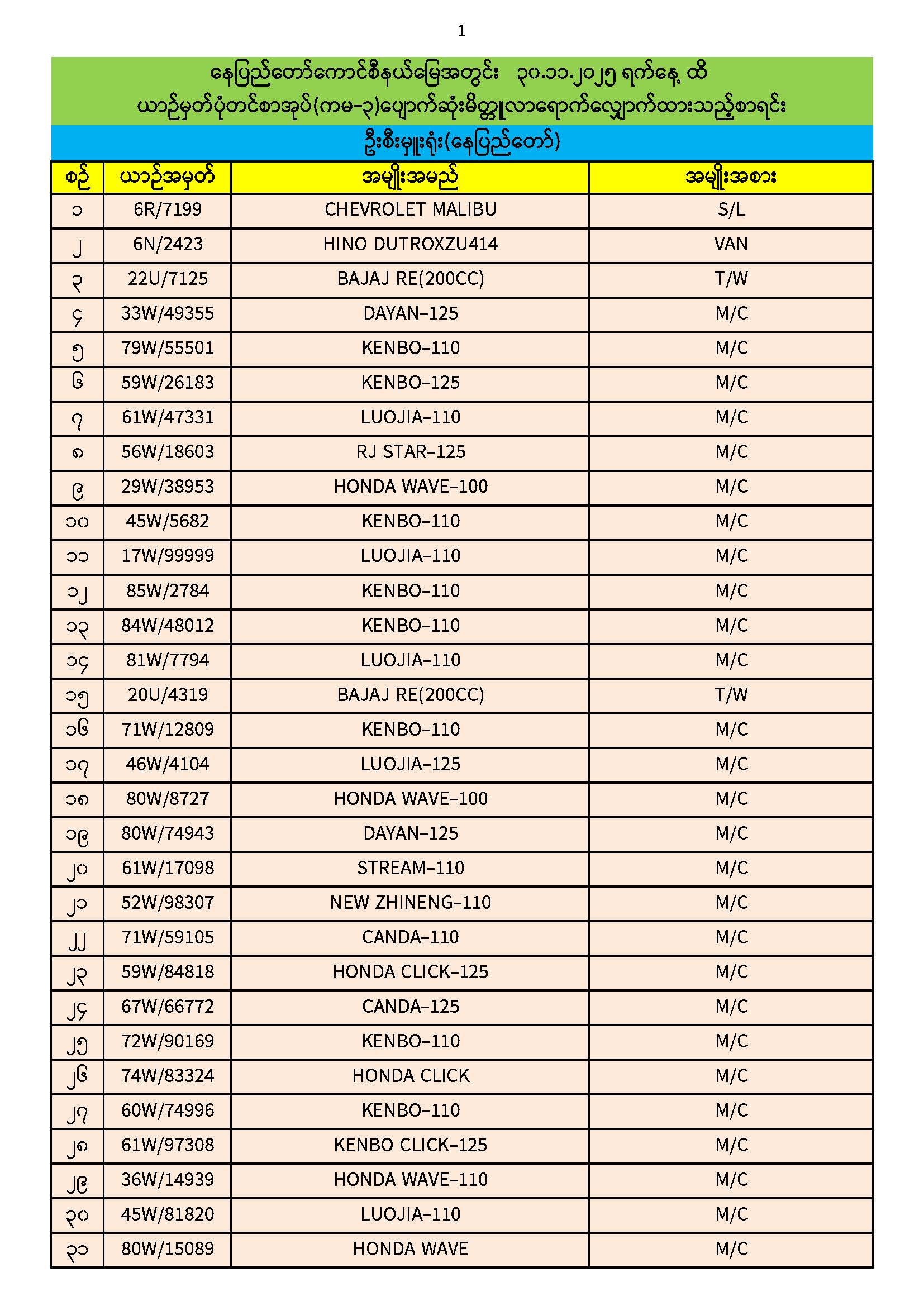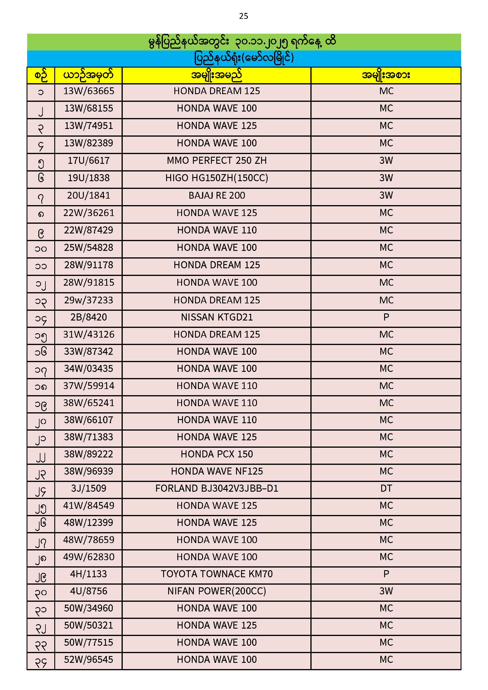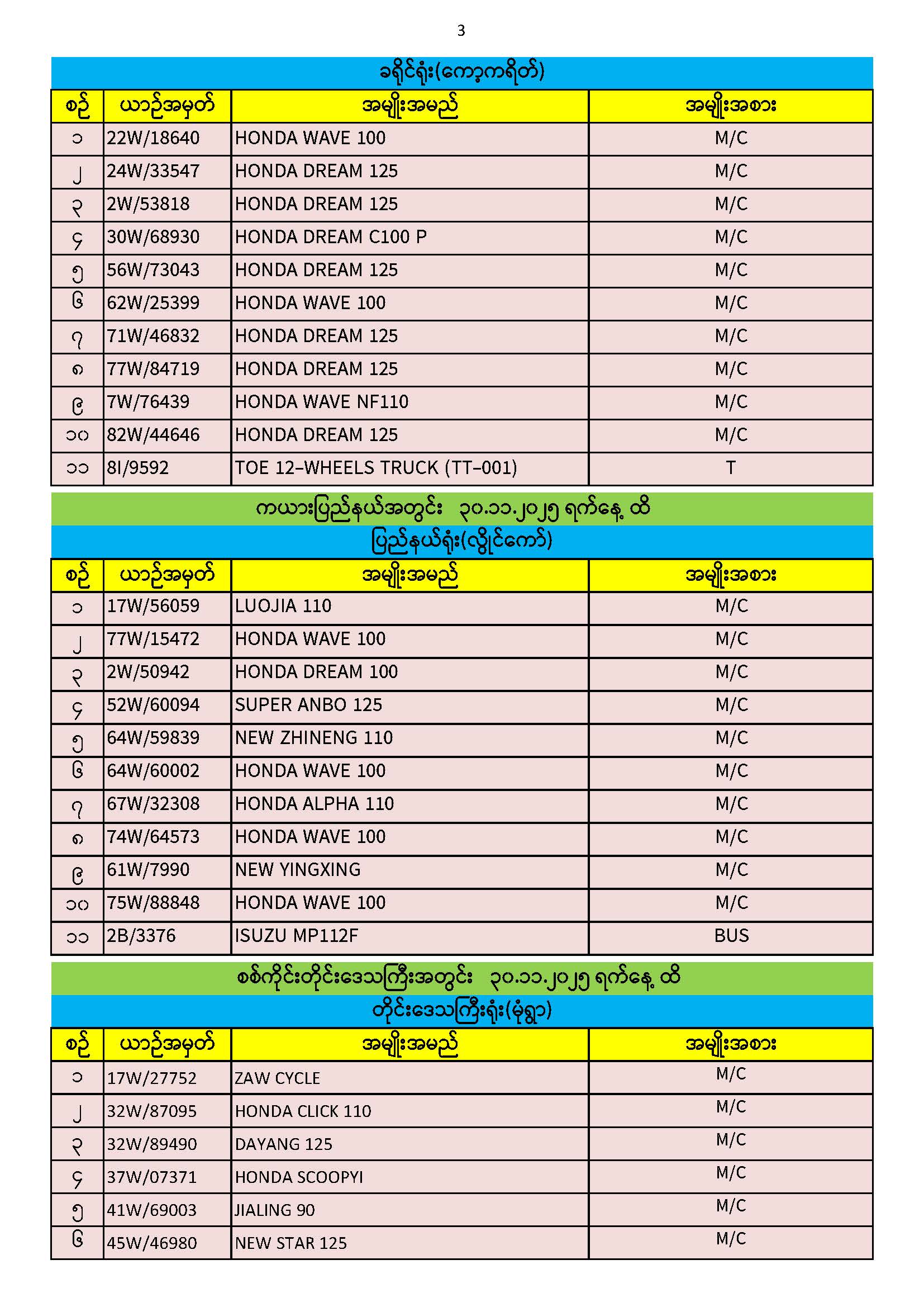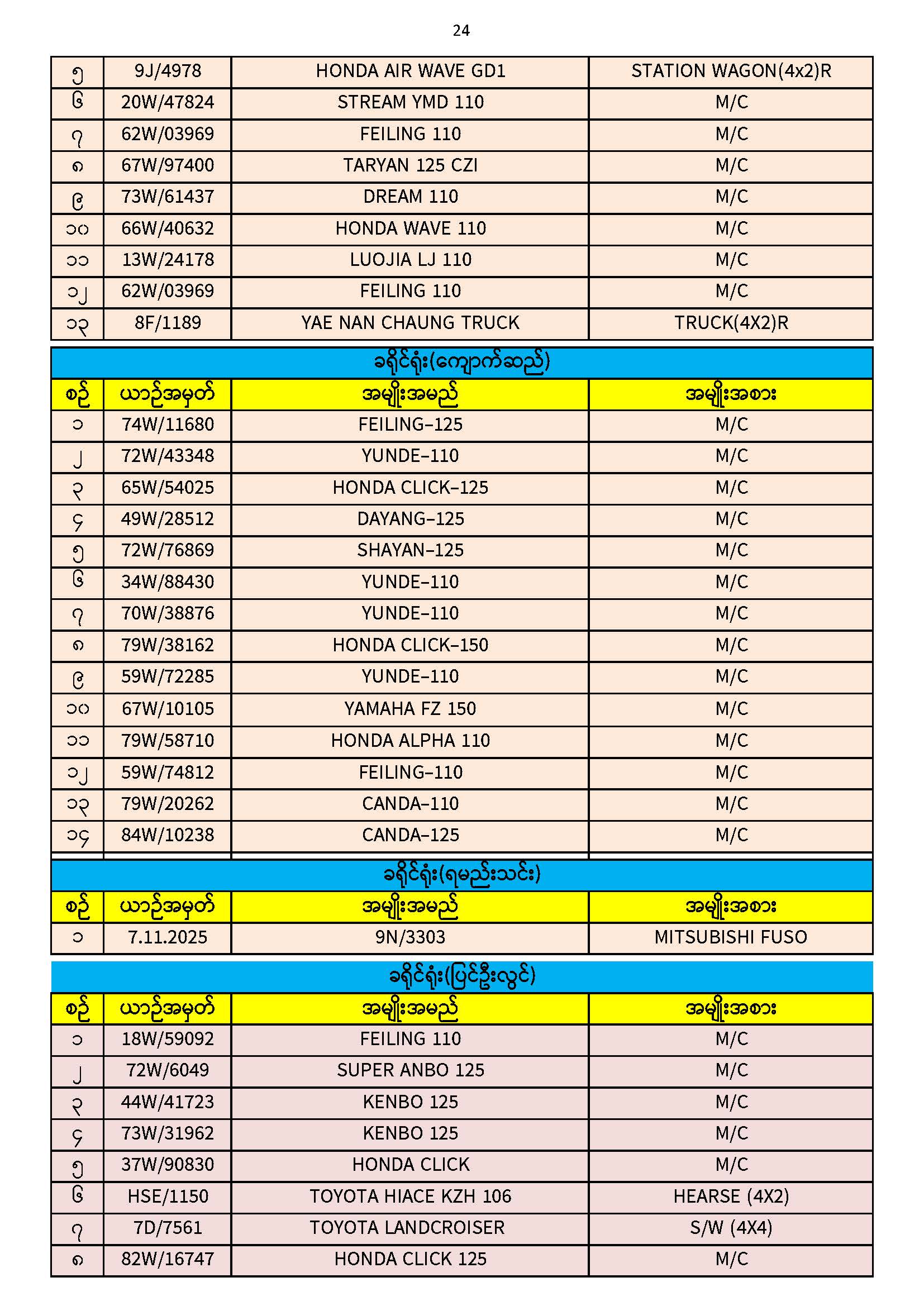 ၃၀.၁၁.၂၀၂၅ ရက်နေ့ထိ ယာဉ်မှတ်ပုံတင်စာအုပ်(ကမ-၃) ပျောက်ဆုံးမိတ္တူလာရောက် လျှောက်ထားသည့်စာရင်း