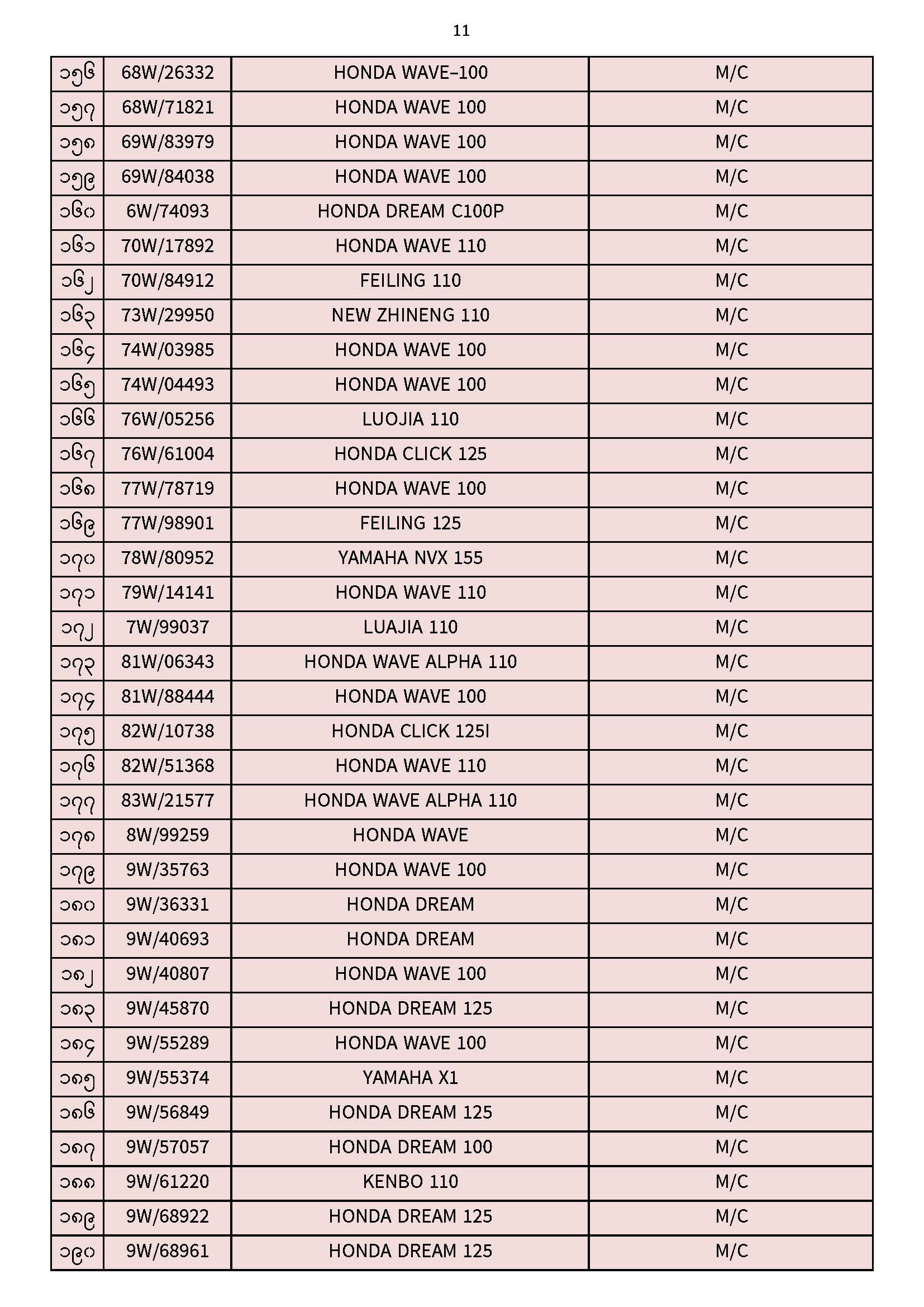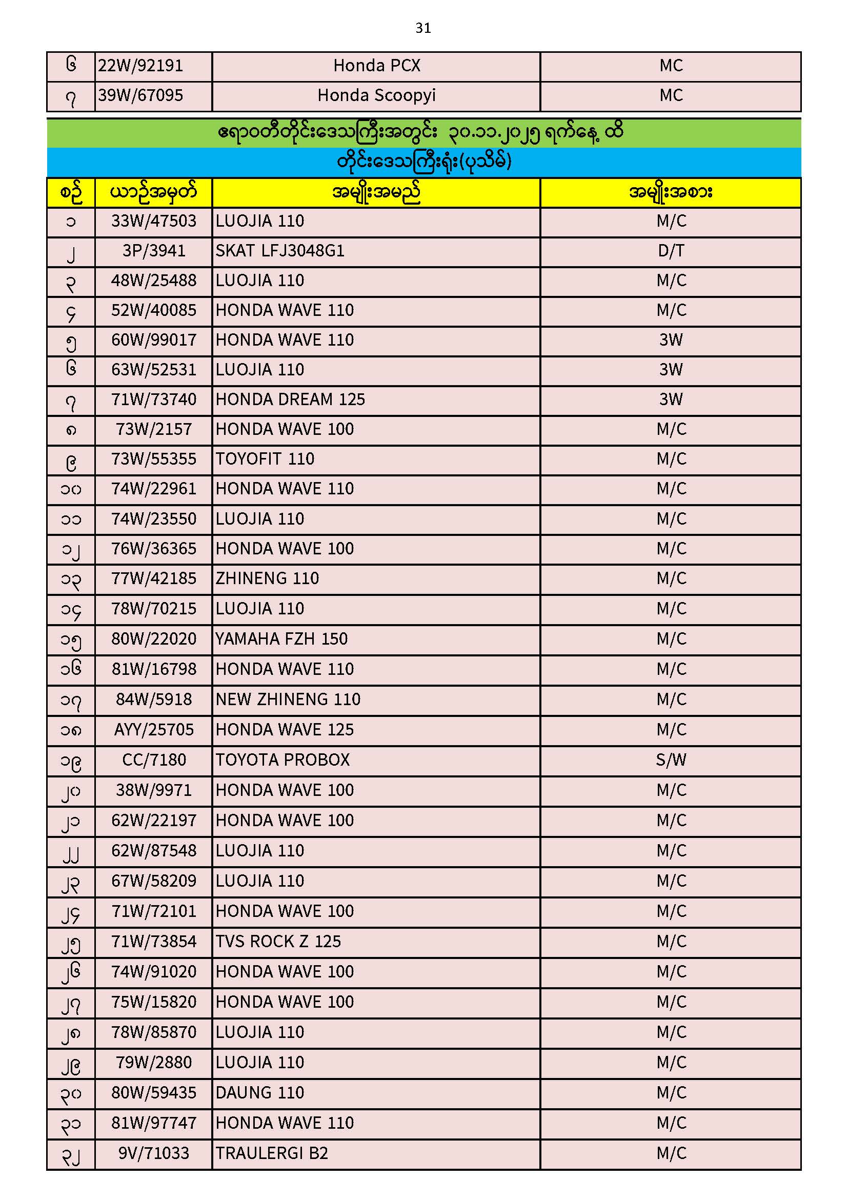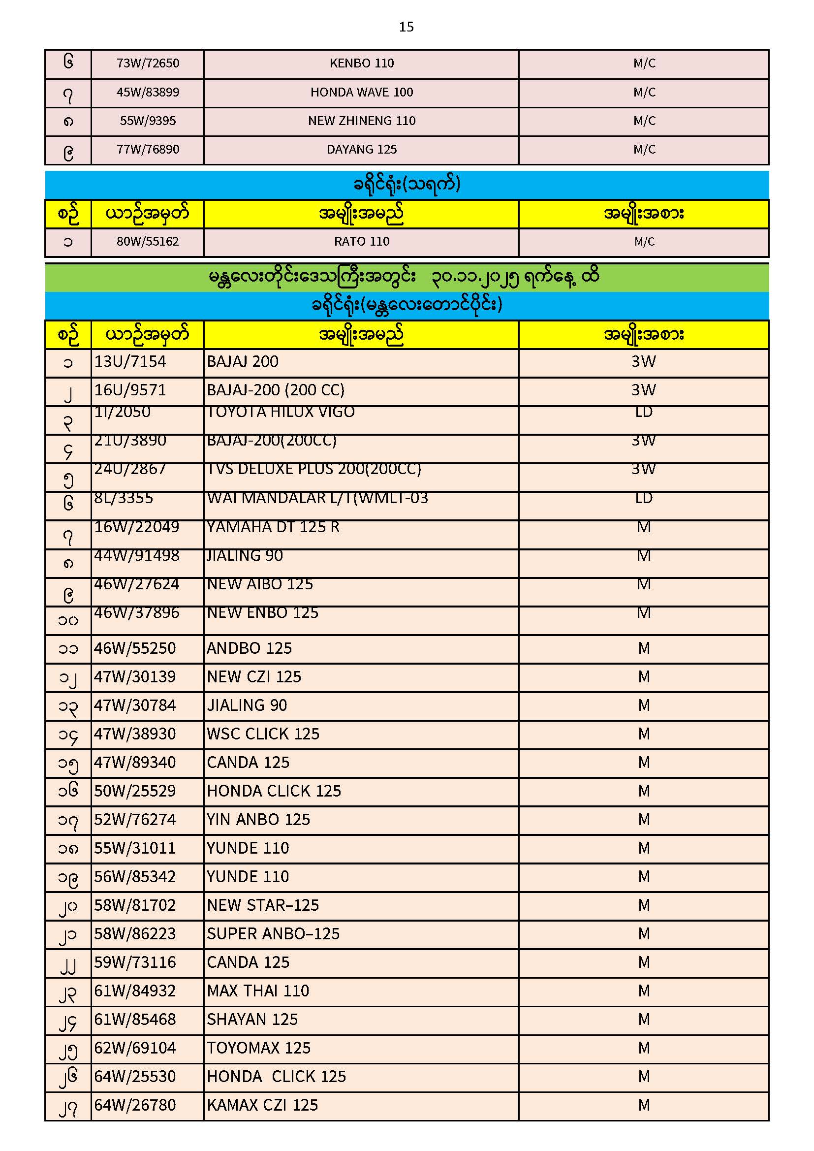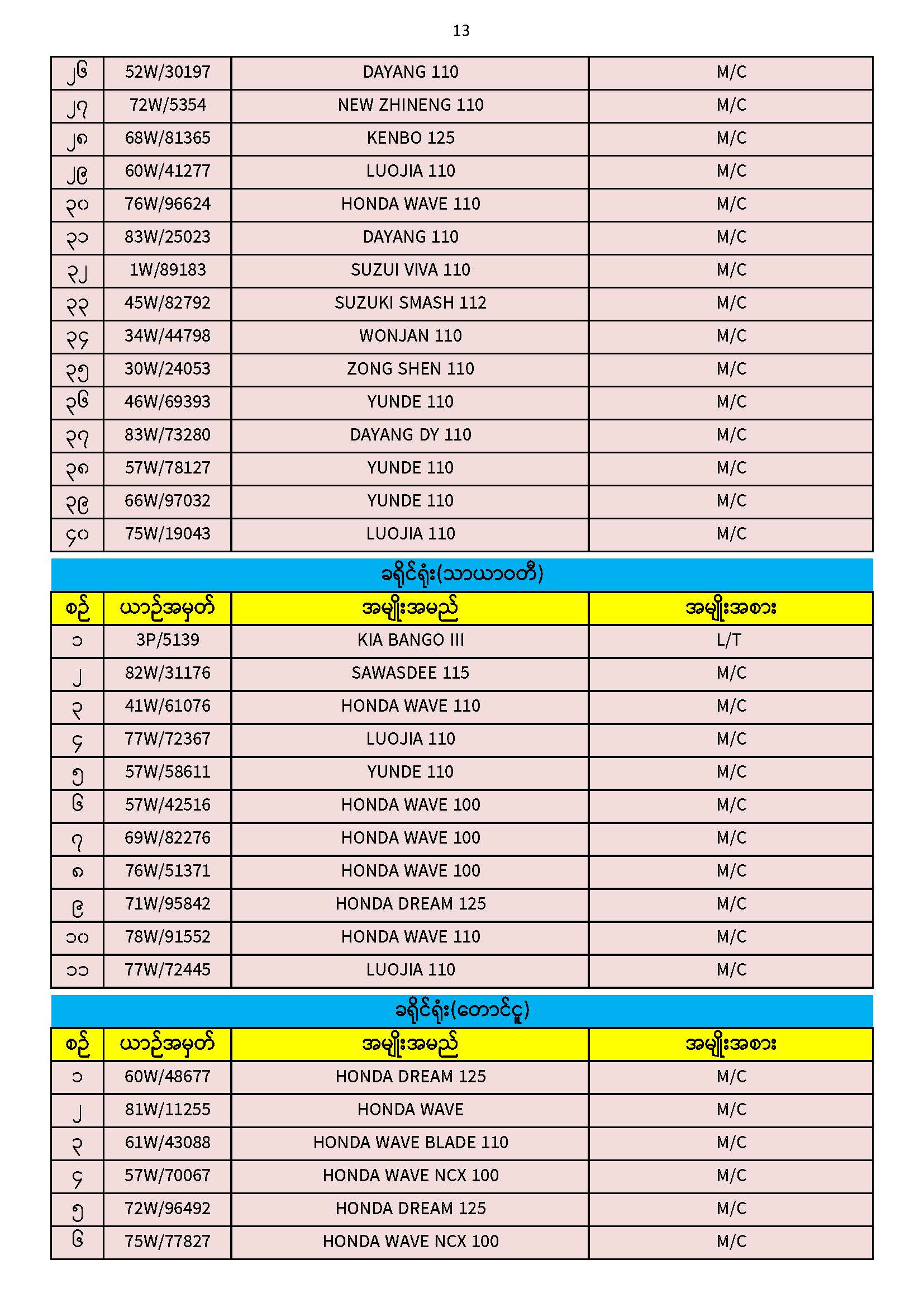၃၀.၁၁.၂၀၂၅ ရက်နေ့ထိ ယာဉ်မှတ်ပုံတင်စာအုပ်(ကမ-၃) ပျောက်ဆုံးမိတ္တူလာရောက် လျှောက်ထားသည့်စာရင်း
