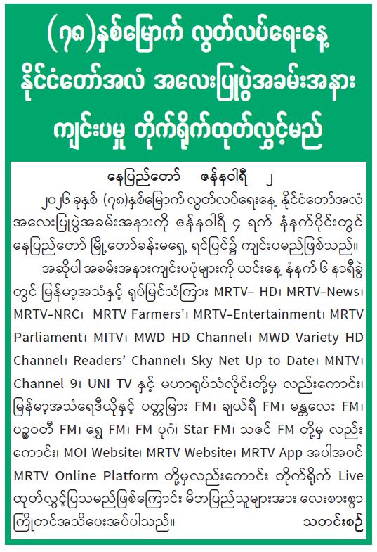 ၁။ ပြည်ထောင်စုရွေးကောက်ပွဲကော်မရှင်သည် ၂၀၂၅ ခုနှစ်၊ ဒီဇင်ဘာလ ၂၈ ရက်နေ့၌ စတင်ကျင်းပခဲ့သည့် ပါတီစုံဒီမိုကရေစီအထွေထွေရွေးကောက်ပွဲတွင် ပြည်တွင်း ပြည်ပရှိ ဆန္ဒမဲပေးပိုင်ခွင့်ရှိသည့် မဲဆန္ဒရှင်ပြည်သူများအနေဖြင့် နိုင်ငံသားတစ်ဦး၏အခွင့်အရေးဖြစ်သည့် မဲပေးပိုင်ခွင့် မဆုံးရှုံးစေရေးအတွက် ကြိုတင်ဆန္ဒမဲပေးနိုင်ရေး ဥပဒေပြဋ္ဌာန်းချက်များနှင့်အညီ စီစဉ်ဆောင်ရွက်ပေးခဲ့ပါသည်။