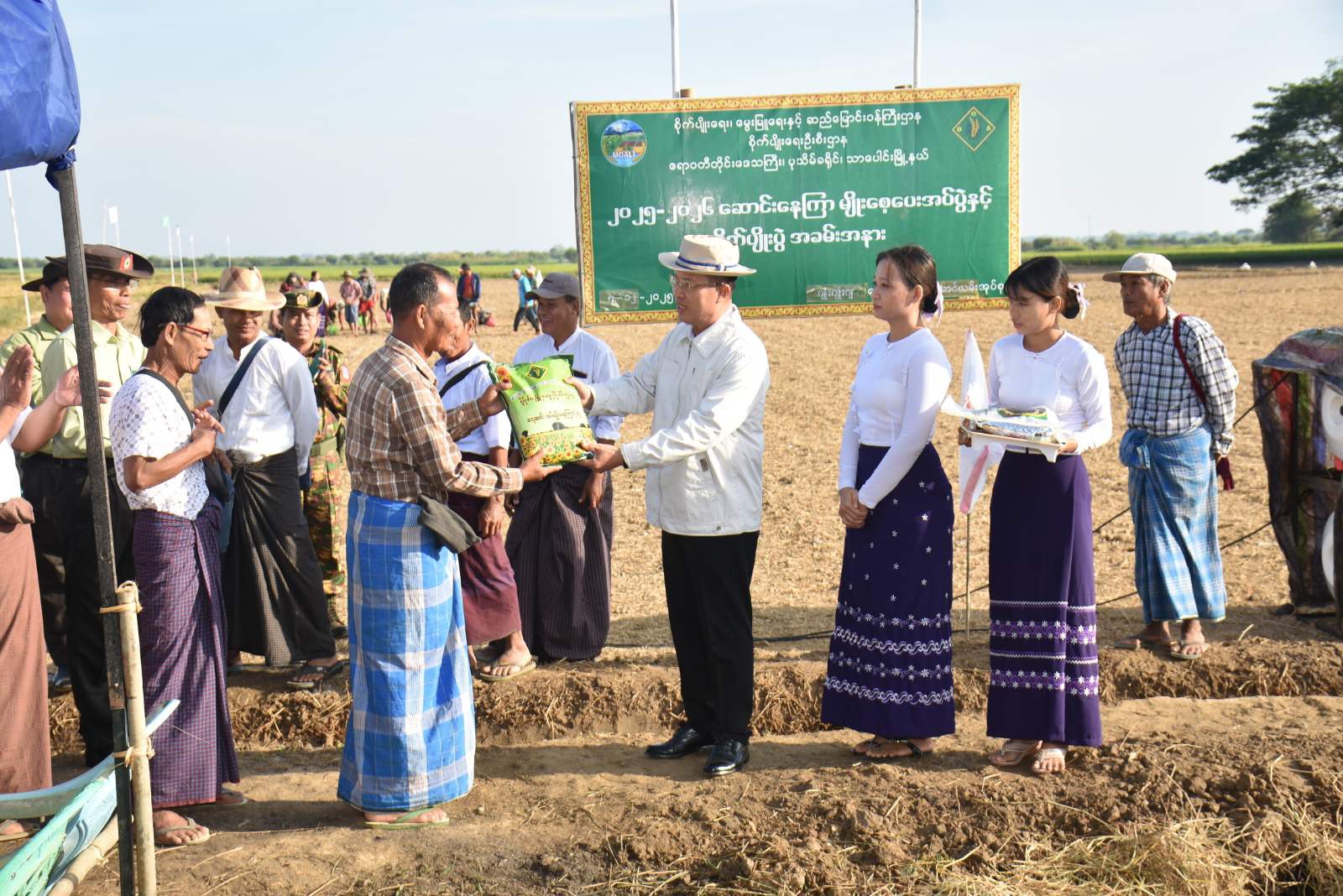 ဧရာဝတီတိုင်းဒေသကြီး၊ ပုသိမ်ခရိုင်၊ သာပေါင်းမြို့နယ်၊ ဆင်လမ်းကျေးရွာအုပ်စု၊ ဂျုံးဂျုံးကျကျေးရွာ တောင်သူဦးသိန်းစိုး၏ စိုက်ဧက(၁၀)ဧကတွင် ၂၀၂၅-၂၀၂၆ ဆောင်းနေကြာ မျိုးစေ့ပေးအပ်ပွဲနှင့် စိုက်ပျိုးပွဲ အခမ်းအနားကို (၇.၁၂.၂၀၂၅) ရက်နေ့ နံနက်ပိုင်းက ပြုလုပ်ခဲ့ရာ တိုင်းဒေသကြီးဝန်ကြီးချုပ်ဦးတင်မောင်ဝင်းသည် တာဝန်ရှိသူများနှင့်အတူ တက်ရောက်၍ တောင်သူများအား နေကြာမျိုးစေ့ပေးအပ်ခဲ့သည်။