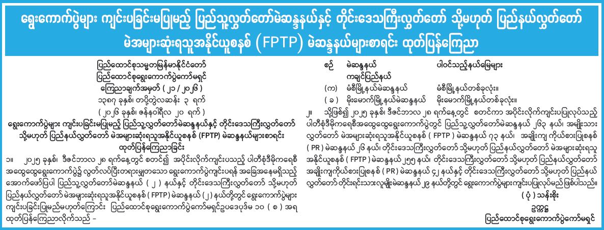 ရွေးကောက်ပွဲများ ကျင်းပခြင်းမပြုမည့် ပြည်သူ့လွှတ်တော်မဲဆန္ဒနယ်နှင့် တိုင်းဒေသကြီးလွှတ်တော် သို့မဟုတ် ပြည်နယ်လွှတ်တော် မဲအများဆုံးရသူအနိုင်ယူစနစ် (FPTP) မဲဆန္ဒနယ်များစာရင်း ထုတ်ပြန်ကြေညာ