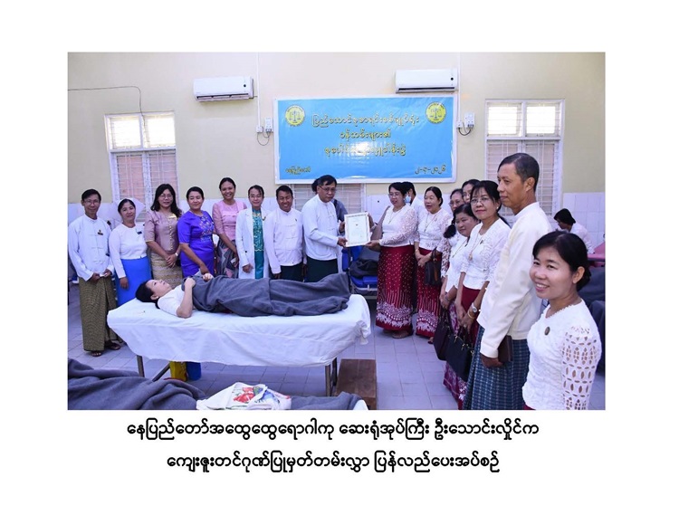 ထို့နောက် နေပြည်တော်အထွေထွေရောဂါကု ဆေးရုံအုပ်ကြီး ဦးသောင်းလှိုင်က ဆေးရုံတက်ရောက်ကုသလျက်ရှိသော လူနာများအတွက် သွေးလာရောက်လှူဒါန်းကြသည့် ပြည်ထောင်စုစာရင်းစစ်ချုပ်ရုံးမှ ဝန်ထမ်းများအား ကျေးဇူးတင်ဂုဏ်ပြုမှတ်တမ်းလွှာ ပြန်လည်ပေးအပ်ခဲ့သည်။