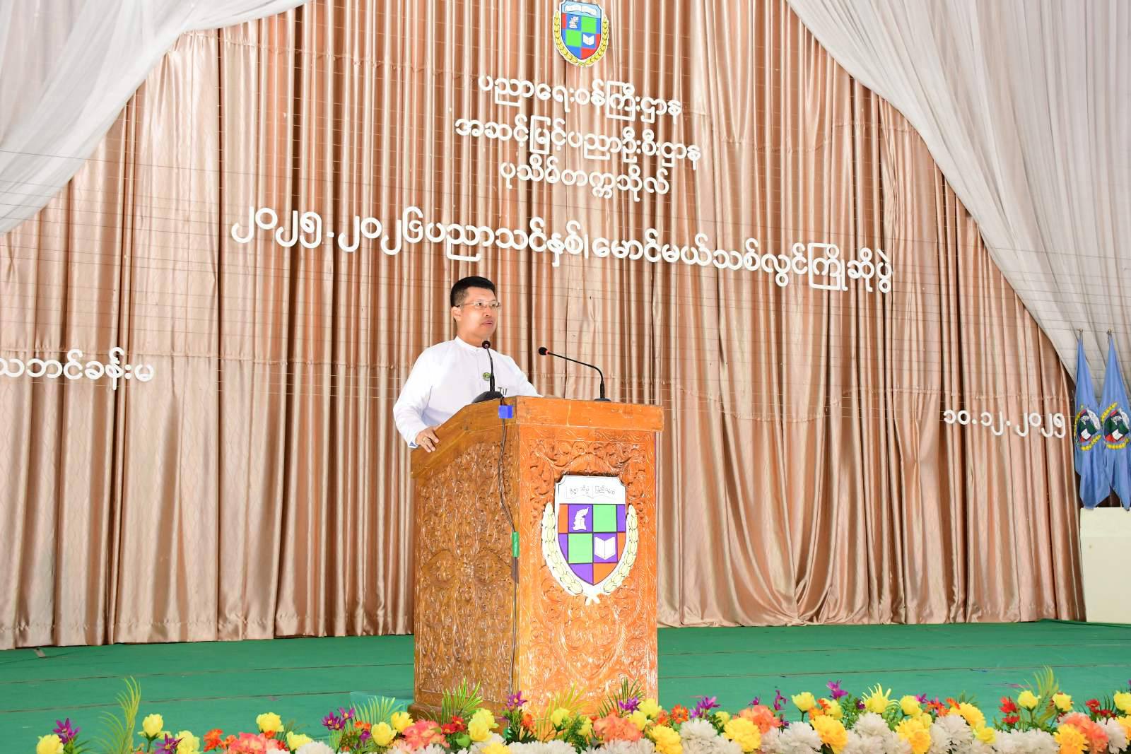 ဦးစွာ တိုင်းဒေသကြီးဝန်ကြီးချုပ်နှင့် ဧည့်သည်တော်များသည် ကရင်တိုင်းရင်းသားရိုးရာအကဖြင့် ကပြဖျော်ဖြေမှုများကို ကြည့်ရှုအားပေးပြီး တိုင်းဒေသကြီးဝန်ကြီးချုပ်က“ မောင်တို့မယ်တို့အနေဖြင့် တက္ကသိုလ်ဝင် စာမေးပွဲ အောင်မြင်ခဲ့ကြပြီး ဘာသာရပ်များအလိုက် အဆင့်မြင့်ပညာများကို ဆက်လက်လေ့လာသင်ယူ ကြရမည့်သူများဖြစ်ပါကြောင်း၊ ပုသိမ်တက္ကသိုလ်ကြီးသည် အစဉ်အလာရှိသည့် တက္ကသိုလ်ကြီး ဖြစ်ပြီး လူ့စွမ်းအားအရင်းအမြစ်များစွာ နှစ်စဉ်မွေးထုတ်ပေးလျက်ရှိပါကြောင်း၊ တက္ကသိုလ်ဆိုသည်မှာ တွေးတောကြံဆခြင်း အလေ့အကျင့်ကောင်း များကို ပြုစုပျိုးထောင်ပေးရာနေရာဖြစ်ရာ မောင်တို့မယ်တို့အနေဖြင့် စိတ်အေးချမ်းစွာ ပညာသင်ယူနိုင်ရေးအတွက် တက္ကသိုလ် ဝန်းကျင်စိမ်းလန်းစိုပြေရေး၊ အဆောက်အဦများ ခန့်ညားထည်ဝါမှုရှိစေရေး အတွက်လည်း တိုင်းဒေသကြီး အစိုးရအဖွဲ့အနေဖြင့် ကြိုးပမ်းဆောင်ရွက်ပေးလျက်ရှိပါကြောင်း၊ မောင်တို့မယ်တို့ သည် တက္ကသိုလ်ကျောင်းတော်ကြီးတွင် မိမိတို့ဝါသနာပါသည့်အားကစား၊ စာပေ ၊ ဂီတ၊ အနုပညာ ဆိုင်ရာများကိုလည်းလေ့လာသင်ယူခွင့်ရကြမည်ဖြစ်ပါကြောင်း၊ ထို့အပြင်မိမိတို့၏ ကျောင်းတော်ကြီး စိမ်းလန်းစိုပြေရေးနှင့် ပန်းပေါင်းဝေဆာသည့်ကျောင်းတော်ကြီးဖြစ်စေရေး၊ Green Zone Area များ ဖော်ဆောင်ရေးလုပ်ငန်းများတွင်လည်း ပူးပေါင်းဆောင်ရွက်ကြရန် လိုပါကြောင်း၊ မောင်တို့မယ်တို့ အနေဖြင့် အဆင့်မြင့်ပညာများကိုလေ့လာဆည်းပူးပြီး သုတေသနပြုမှု၊ တီထွင်ဖန်တီးမှုတွေကို တိုးတက် အောင်မြင်အောင်ကြိုးစားသင်ယူကြရမည်ဖြစ်ပါကြောင်း၊ မောင်တို့မယ်တို့သည်ဒေသနှင့် နိုင်ငံအကျိုး ဖော်ဆောင်ပေးနိုင်သူများ ဖြစ်အောင်ကြိုးစား၍ တက္ကသိုလ်ပညာရပ်များကို လေ့လာဆည်းပူးရင်း ဗလငါးတန်ပြည့်စုံသောလူငယ်လူရွယ်များဖြစ်အောင် ကြိုးစားသွားကြရန် လိုပါ ကြောင်း” အမှာစကားပြောကြားခဲ့ပြီး မောင်မယ်သစ်လွင်များ၊ တက္ကသိုလ်များ ဇုန်ပေါင်းစုံ အမျိုးသားဘောလုံးပြိုင်ပွဲတွင် ရွှေတံဆိပ်ဆုနှင့် အမျိုးသမီးဘောလုံးပြိုင်ပွဲတွင် ရွှေတံဆိပ်ဆုများရရှိခဲ့ကြသည့် ပုသိမ်ဇုန် အမျိုးသား/ အမျိုးသမီးဘောလုံးအသင်း၊ (၂၆)ကြိမ်မြောက် မြန်မာ့ရိုးရာယဉ်ကျေးမှု အဆို၊ အက၊ အရေး၊ အတီး(ဗဟိုအဆင့်)ပြိုင်ပွဲ ရွှေတံဆိပ်ဆုရှင်၊ ပုသိမ်တက္ကသိုလ်တိုင်းရင်းသားစာပေနှင့်ယဉ်ကျေးမှုကော်မတီအကအဖွဲ့တို့အား ဂုဏ်ပြုချီးမြှင့်ငွေများပေးအပ်ခဲ့ရာ ပုသိမ်တက္ကသိုလ် ပါမောက္ခချုပ်နှင့် ကျောင်းသား၊ ကျောင်းသူများက လက်ခံရယူခဲ့သည်။