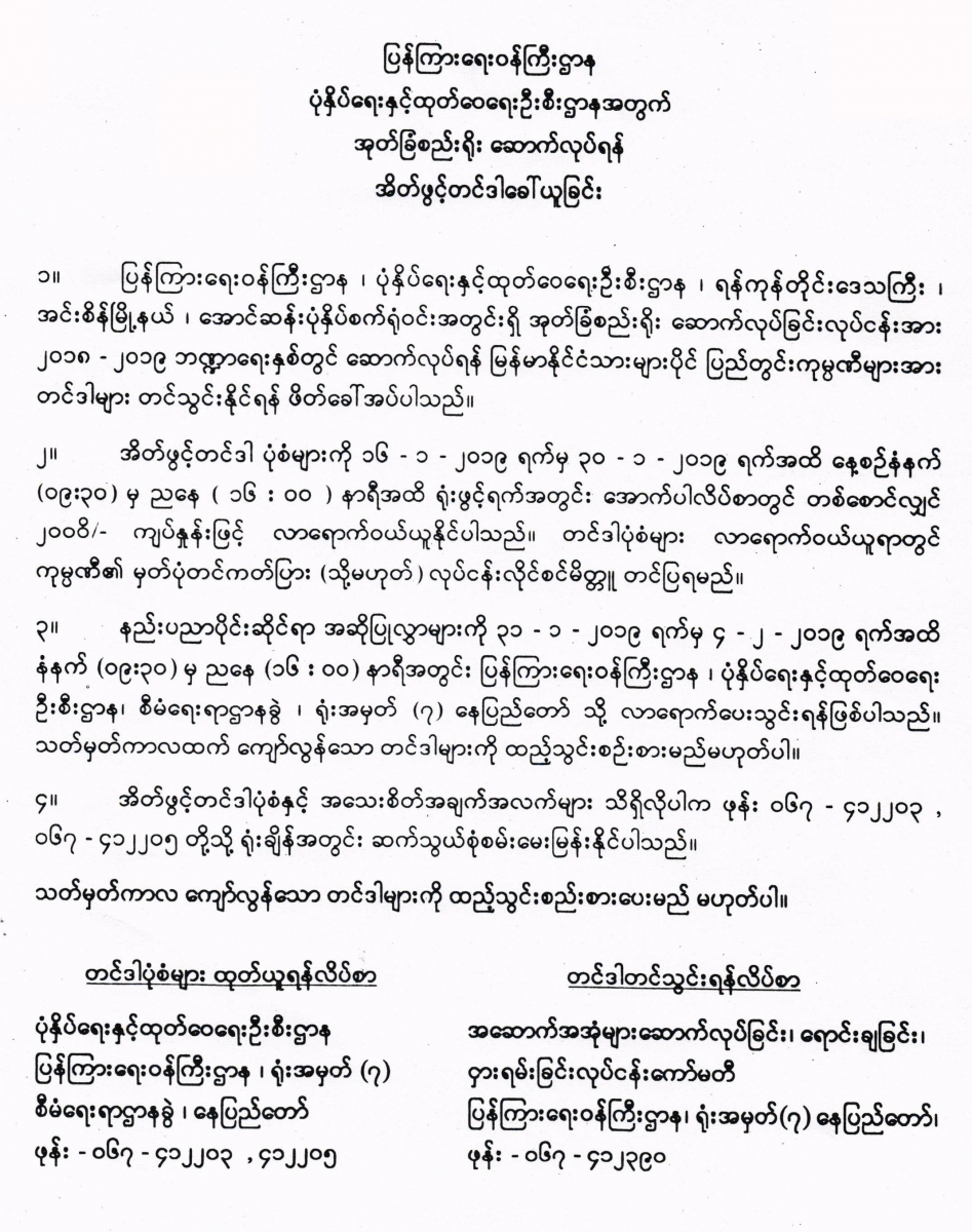 ပြန်ကြားရေးဝန်ကြီးဌာန၊ ပြန်ကြားရေးနှင့်ပြည်သူ့ဆက်ဆံရေးဦးစီးဌာန၊ အဆောက်အအုံဟောင်း(2) Lot ကို ဝယ်ယူရန် အိတ်ဖွင့်တင်ဒါခေါ်ယူခြင်း