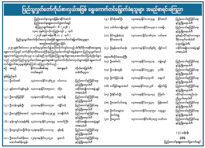 ပြည်သူ့လွှတ်တော်ကိုယ်စားလှယ်အဖြစ် ရွေးကောက်တင်မြှောက်ခံရသူများ အမည်စာရင်းကြေညာ