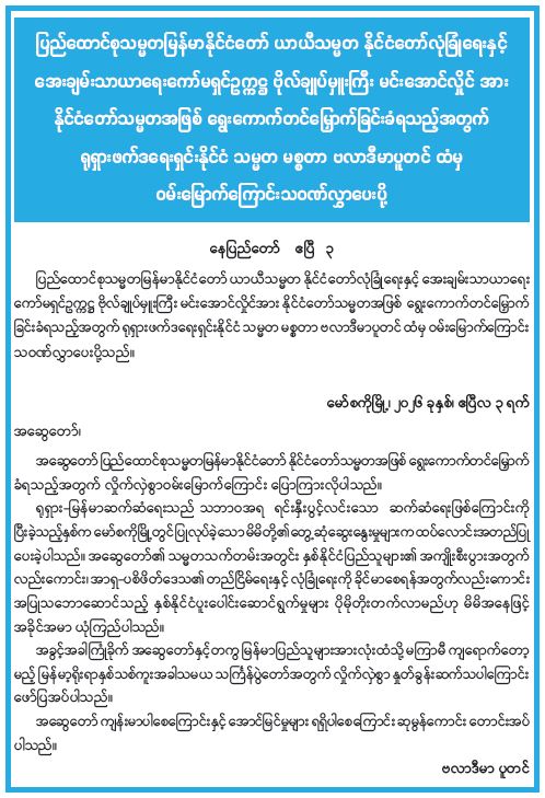 ပြည်ထောင်စုသမ္မတမြန်မာနိုင်ငံတော် ယာယီသမ္မတ နိုင်ငံတော်လုံခြုံရေးနှင့် အေးချမ်းသာယာရေးကော်မရှင်ဥက္ကဋ္ဌ ဗိုလ်ချုပ်မှူးကြီး မင်းအောင်လှိုင် အား နိုင်ငံတော်သမ္မတအဖြစ် ရွေးကောက်တင်မြှောက်ခြင်းခံရသည့်အတွက် ဘယ်လာရုစ်သမ္မတနိုင်ငံ သမ္မတ မစ္စတာ အလက်ဇန္ဒား လူကာရှန်ကို ထံမှ ဝမ်းမြောက်ကြောင်းသဝဏ်လွှာပေးပို့