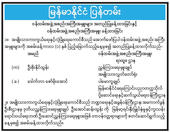 အခွန်ထမ်းမှတ်ပုံတင်ခြင်းဆိုင်ရာ လုပ်ငန်းစဉ်များတွင် အီလက်ထရောနစ် အခွန်ထမ်းမှတ်ပုံတင်စနစ်ဖြင့် ပြောင်းလဲကျင့်သုံးသွားမည့် အစီအစဉ်ကို အသိပေးကြေညာခြင်း