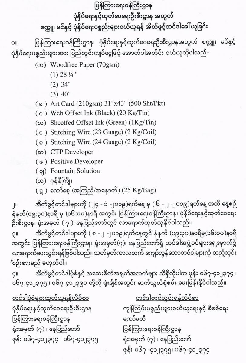 ပြန်ကြားရေးဝန်ကြီးဌာန၊ ပုံနှိပ်ရေးနှင့် ထုတ်ဝေရေးဦးစီးဌာနအတွက် စက္ကူ၊ မင်နှင့် ပုံနှိပ်ရေး ပစ္စည်းများ ဝယ်ယူရန် အိတ်ဖွင့်တင်ဒါခေါ်ယူခြင်း