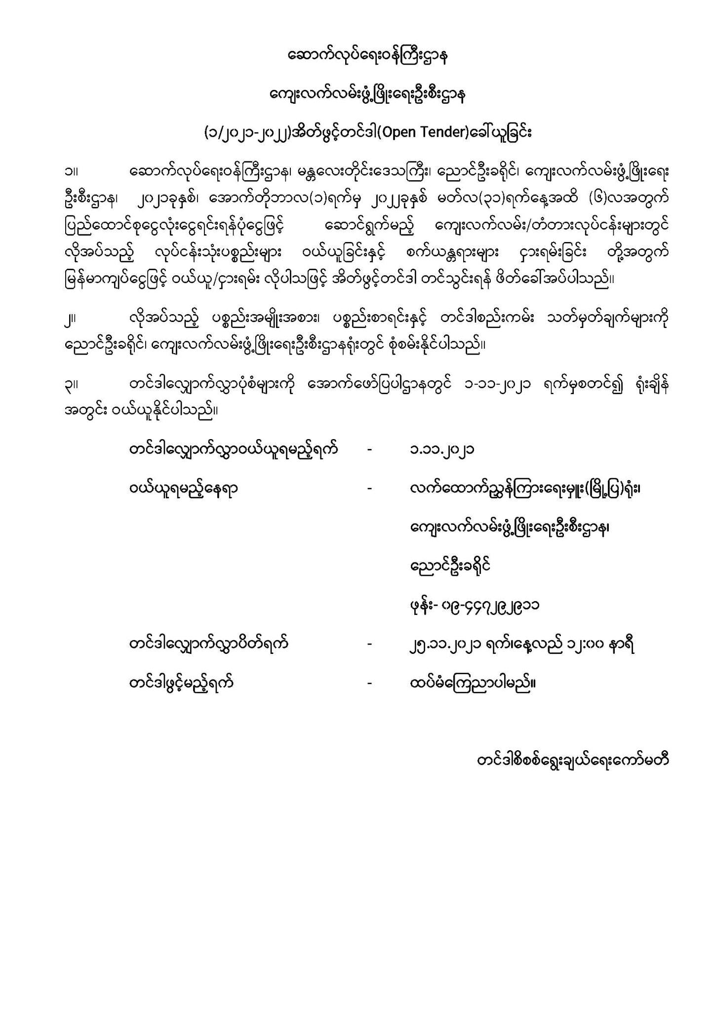 ကျောက်ဆည်ခရိုင်မှ ကျေးလက်လမ်းတံတား တည်ဆောက်ရေးလုပ်ငန်းများတွင် လိုအပ်သည့် လုပ်ငန်းသုံးပစ္စည်းများဝယ်ယူရန်အတွက် အိတ်ဖွင့်တင်ဒါခေါ်ယူခြင်း
