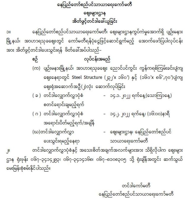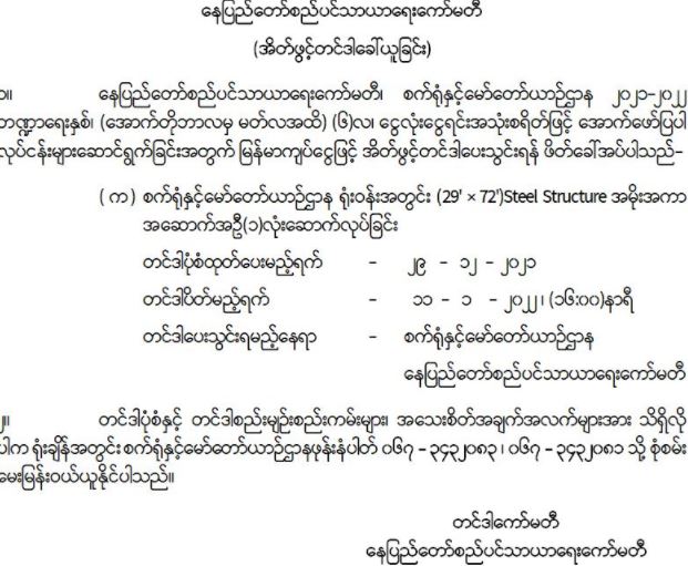 နေပြည်တော်စည်ပင်သာယာရေးကော်မတီ၊ စက်ရုံနှင့်မော်တော်ယာဉ်ဌာန မှ အိတ်ဖွင့်တင်ဒါခေါ်ယူခြင်း